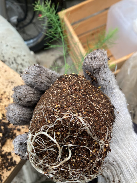 アスパラの苗のポットの11cmから13cmに一回り大きくして、